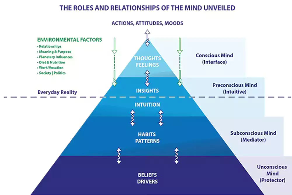 The primary language of the preconscious mind is shaped by metaphysical concepts/ideology and deep-seated feelings – these are heartfelt, seemingly intangible murmurings emerging from the core. This is why introspective activities such as meditation, yoga nidra, conscious breathing, creative visualisation, mindfulness and prayer are all useful vehicles for communicating at this level.